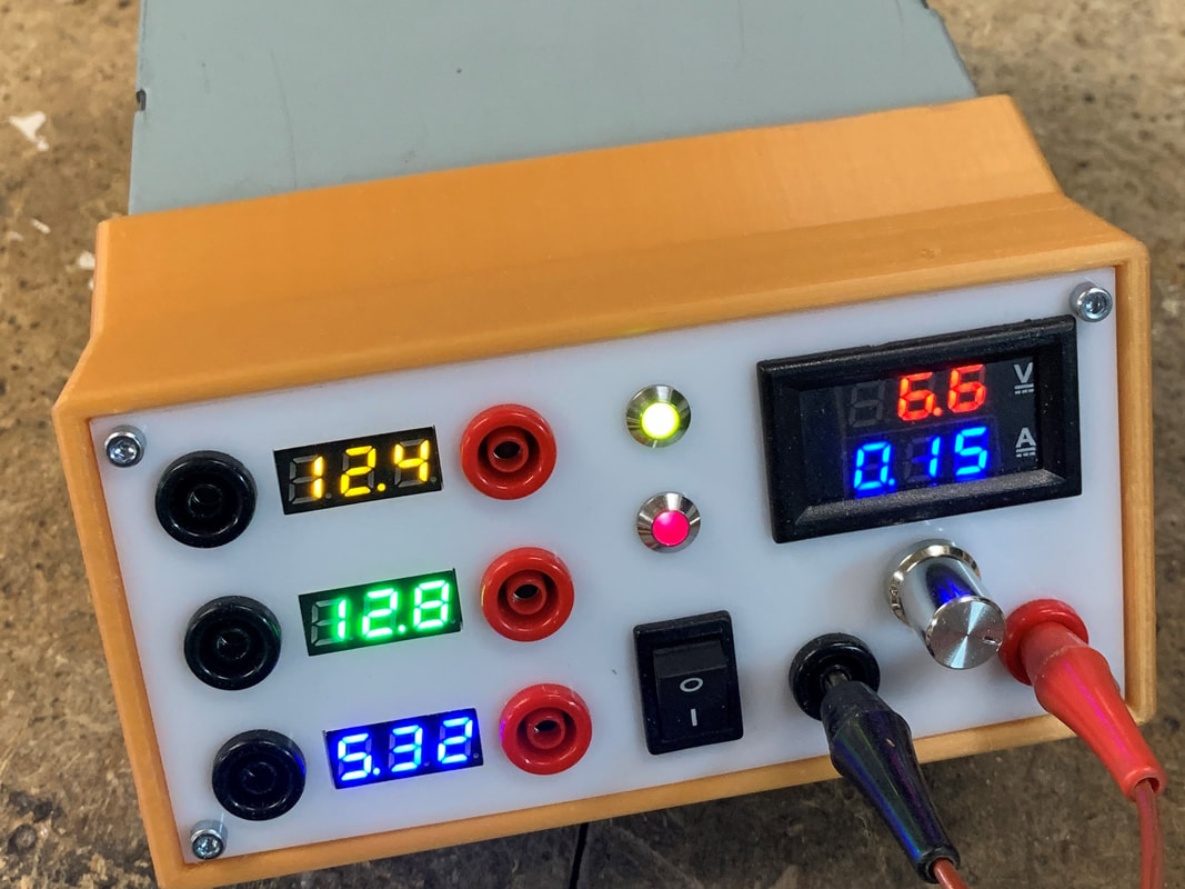 aus einem alten computer-netzteil mit elektronischen komponenten aufgebaut in einem 3d-gedruckten gehäuse
